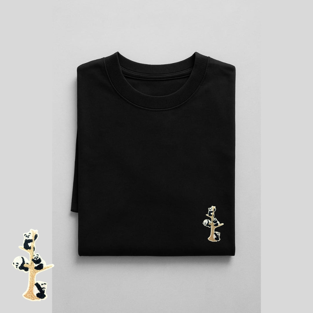 White and Black Oversized T-Shirt with Cute Panda Tree Embroidery | Unisex Drop Shoulder Tee